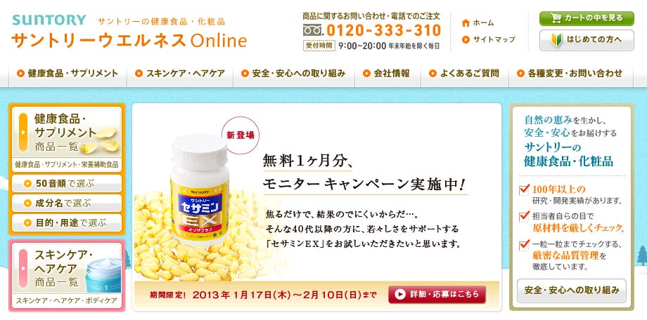 応募は2013年2月10日(日)までで、1万名に90g入りのセサミンEXを無料でプレゼントするというものです。